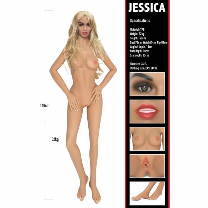 Jessica er en stor kærlighedsdukke i naturlig størrelse, lavet af førsteklasses materialer som glat TPE. Designet har et robust stålskelet for maksimal holdbarhed og fritstående brug, samt fleksibilitet til at placere dukken i en valgfri position. Hver Bangers Babes-dame har realistiske orale, vaginale og anale teksturerede kanaler, der kan varmes op/varmes op efter behov. Andre naturtro detaljer inkluderer: kvalitetsparaply, kunstige negle og fine ansigtstræk. Denne dejlige dame overholder en enestående kvalitetsstandard og vil være din yndlingslegetøj i mange år fremover.